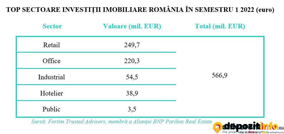 Pe locul doi, în topul domeniilor în care s-a investit, se află segmentul de birouri, cu tranzacții care au totalizat 220,3 milioane de euro.
